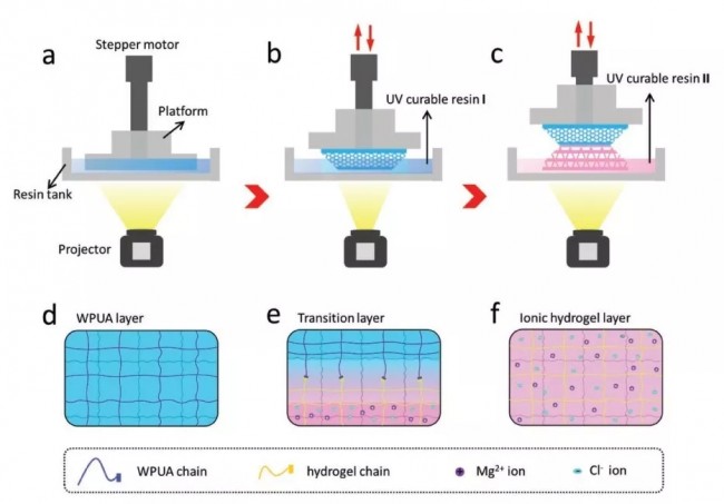 图-1. a-c)双材料3D打印流程示意图。首先,在DLP打印过程中对第一前驱体溶液进行uv固化。接着,在平台上建立了指定的层数后,我们暂停打印进度,将打印部分抬起,用另一个带有第二前驱体的树脂槽替换,然后重新打印,将第二树脂直接固化到前一层。这个过程不断重复,直到整个3D对象构建完成。d-f)WPUA层、WPUA-水凝胶过渡层、水凝胶层中的交联网络示意图