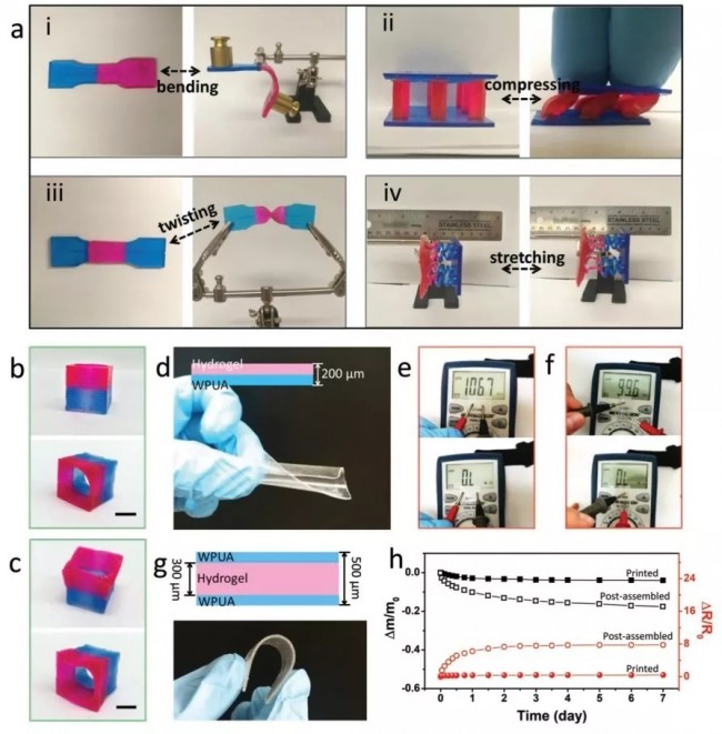 图-2. a)DLP打印WPUA-水凝胶复合材料的形变性能,该复合材料具有良好的拉伸性、弹性、能够承受高水平的压缩变形、扭转变形和弯曲变形,且无明显损伤。b,c)WPUA-水凝胶空心立方体在去离子水中浸泡2h前后的图像。d)WPUA-水凝胶膜具有透明、柔韧的特性(总厚度200µm)e,f)在MgCl2中浸泡2h 前后,双层薄膜的两个表面的导电差异,顶部:水凝胶表面;底部:WPUA表面。g)WPUA-水凝胶-WPUA三层薄膜的结构与图像。h)重量和电阻随空气接触时间的变化曲线。