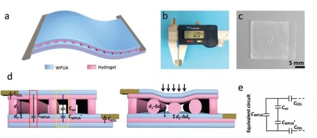 图-3. a)全印刷电容式传感器示意图。b)传感器的总厚度为1.2mm,它是由600µm结构的水凝胶层和300µm厚水凝胶层作为电极,其余三层100m WPUA薄膜作为中间介电层、顶层和底层的绝缘层。c)数码照片显示内部结构的全印刷电容式传感器。d)电压偏置(1V)下具有梁结构特征的离子皮肤等效电路原理图,其中,Cedl为金属电极与离子水凝胶导体界面处形成的双电层,CWPUA为两个水凝胶电极接触部分WPUA介质的电容,Cair和CWPUA分别为空气介质电容和悬浮部分的WPUA介质电容,d0为WPUA介质层初始厚度100µm,d1为空气介质层厚度,等于水凝胶结构的初始高度,Δd1和Δd0为压力状态下空气介质和WPUA介质层的厚度变化,红虚线和黄虚线围起来的分别为接触部分和悬浮部分。e)离子皮肤的等效电路图