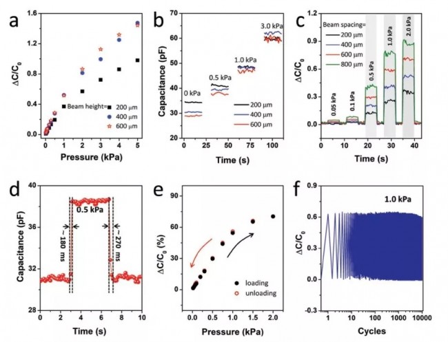 图-4.全打印离子皮肤的性能。a)相对电容变化(ΔC/C0)与不同光束高度的全印刷传感器所受压力的响应曲线。b)在0.5-5KPa压力范围内不同光束高度的全打印传感器的感应噪声。c)不同施加压力以及不同光束间距传感器电容响应随时间变化的曲线。d)全打印传感器对施加与释放的外部压力负载(0.5KPa)的响应与恢复时间。e)全打印传感器的滞后曲线。f)对比0和1.0KPa之间1000次压力循环的全打印传感器的归一化容量测试。