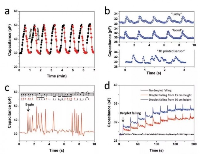 图-5. 全打印离子皮肤的应用演示。a)在指节位置弯曲和挺直压力传感器时电容值的变化。b)在讲“Lucky”“good”“3D-printedsensor”词汇时不同的声音条件下电容的响应变化。c)对音乐节奏响应下实时的电容测试。传感器安装在钢琴的Mi键上,当我们演奏jinglebells时,电容会有节奏的变化。d)不同高度连续水滴的实时电容响应。