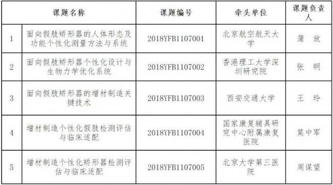 假肢、矫形器的个性化设计与增材制造(3D打印)是国家重点研发计划,与之相关的“假肢矫形器的个性化设计与增材制造应用示范”项目在2018年10月启动。项目周期是2018年5月-2021年4月。涉及的课题包括: