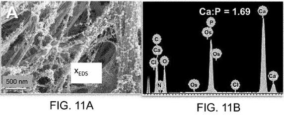 图11显示了在接种后28天通过hMSC的羟基磷灰石合成和沉积,如:(A)SEM;(B)沉积矿物的相应能量色散X射线光谱。hMSC在HAPCL中积极合成并沉积羟基磷灰石(钙磷比为1.69)。骨骼中发现的天然羟磷灰石为1.67,支架制造中使用的HAp为1.59。HAPCL中的细胞产生的HAp比原始支架更为自然。这些结果均表明,HAPCL材料上的干细胞是有活力的,可增殖的,活跃地产生细胞外基质并且正在经历成骨分化。