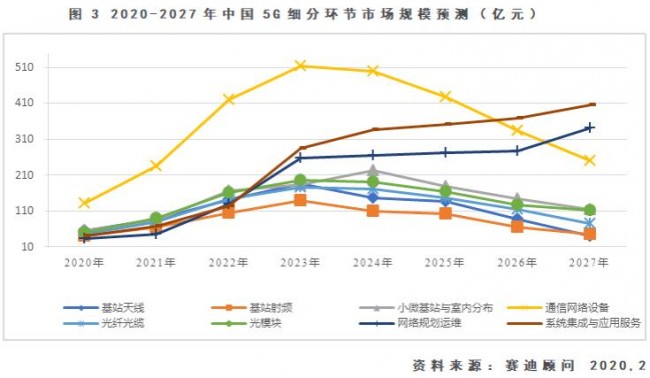 根据赛迪顾问总裁孙会峰,从产业推动要素来看,拉动5G产出增长的动力随着5G商用进程的深化而相继转换:在5G商用初期,运营商大规模开展网络建设,5G网络设备投资带来的设备制造商收入将成为5G直接经济产出的主要来源,预计2020年网络设备和终端设备收入合计约4500亿元,运营商在5G网络设备上的投资将超过2200亿元;5G商用持续推进,互联网企业与5G相关的信息服务收入增长显著,成为直接产出的主要来源,5G设备的支出将稳步增长,预计2030年互联网信息服务收入达到2.6万亿元,各领域在5G设备上的支出将超过5200亿元。