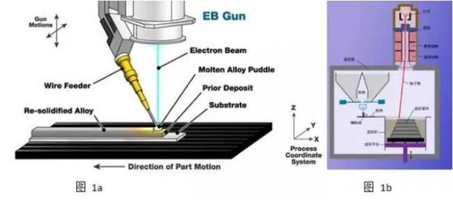 图1 电子束熔融技术示意图 a. 电子束熔丝沉积成形, b. 电子束选区熔化成形。来源:安世亚太