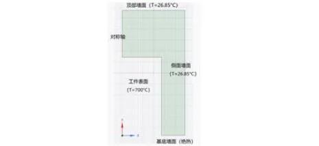 计算中假设打印腔体的顶部及侧面与外界直接接触的区域为室温,底部与打印机底板接触的区域绝热。打印工件为恒定高温,故模型中部矩形区域为恒定700°C。单壁面导热模型边界条件见图3所示。