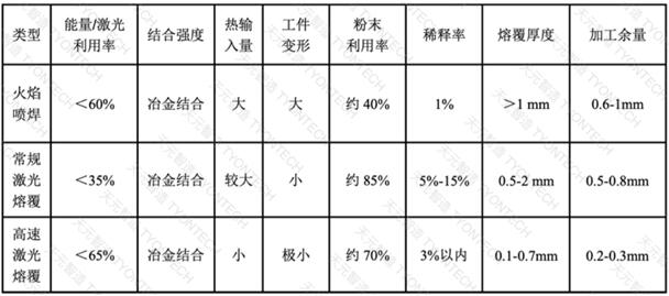 区别于传统激光熔覆,高速激光熔覆通过改变激光与粉末的作用过程,在熔池之上将粉末融熔或半融熔,将融熔或半融熔状态的液体流送入熔池内,形成冶金结合的表面涂层,其熔覆效率与表面质量均得以提升。与喷焊和传统激光熔覆相比,具有效率高、热输入小、稀释率较小、可熔覆薄层、表面平整、后续加工量小等优势。