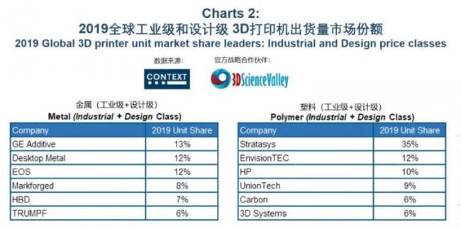 在金属3D打印领域,从打印机销量来看市场份额,进入前5名的企业有GE Additive、EOS、Desktop Metal、Markforged、HBD(汉邦科技)。与2018年相比,工业级和设计级塑料3D打印机的整体出货量下降了-5%,但包括HP和UnionTech(联泰科技)在内的部分设备制造商实现了增长。