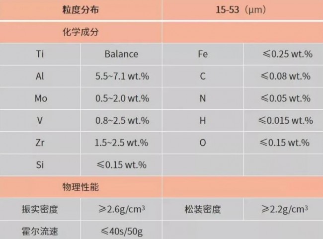 TC4是航空航天、医疗领域中广泛使用的一种钛合金材料。铂力特TC4粉末通过选区激光熔化(SLM)增材制造设备成形后,所得零部件的微观组织均匀致密、具有快速凝固的特征。打印件抗拉强度、屈服强度、延伸率分别高于锻件指标约6~7%、6~10%、55-60%。其中,15~53μm TC4粉末的技术指标如下表。