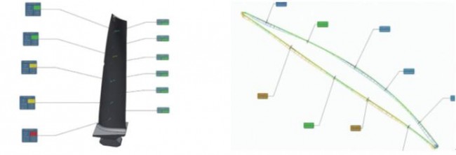 运用专业的定位方法比靠对应点拟合方法要好,检测结果更精确,更全面;与CAD模型的比较结果用误差彩色编码图示更直观,更快捷醒目; 快速的得出叶片所需的airfoil尺寸。