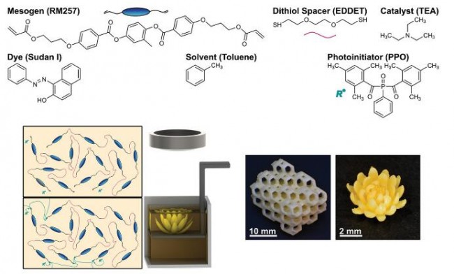 葛锜团队与Yakacki团队合作,通过麦克加成反应将液晶基元与二硫醇单体聚合生成具有丙烯酸酯端基的光敏液晶弹性体低聚物,并可通过基于光固化数字光处理3D打印技术实现液晶弹性体复杂三维结构的3D打印 (图1)。