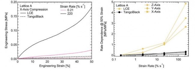 实验表明,不同于普通弹性体,液晶弹性体三维结构的力学性能与加载速率直接相关(图2)。在高速加载(220%/s)条件下,液晶弹性体三维结构单位质量的吸能效率是普通弹性体三维结构吸能效率的27倍(图3)。这表明所开发的光敏液晶弹性低聚物可通过光固化数字光处理3D打印技术获得高效吸能结构和器件。该项研究为3D打印成型轻型抗冲击/减震结构提供了可能性,在电子设备抗冲击、运动头盔等领域具有较大应用潜力。