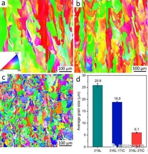 图2是选区激光熔化3D打印后的EBSD结果。从中可以很直观的看出,添加TiC颗粒后,316L的晶粒发生了较大幅度的细化。尤其是316L-3TiC,晶粒从25.9微米细化到6.1微米。