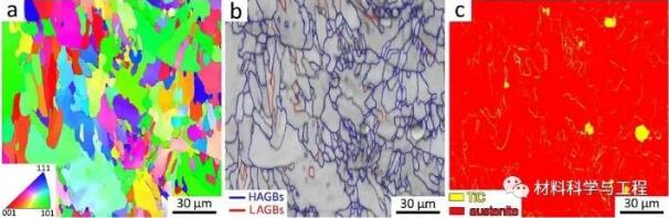 图3 a:EBSD取向图; b:晶界图; c: TiC和奥氏体相分布图。