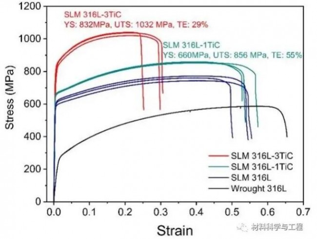 在这项研究中,作者通过添加1wt.% 和3wt.% 的TiC微米颗粒,使打印后的316L-1TiC和316L-3TiC的屈服强度达到660 MPa和832 MPa。分析表明,这种强化来源于晶粒细化和第二相强化。通过与相关文献的对比发现,他们的研究结果(强度和塑性)优于纳米TiC 颗粒强化的316L不锈钢。