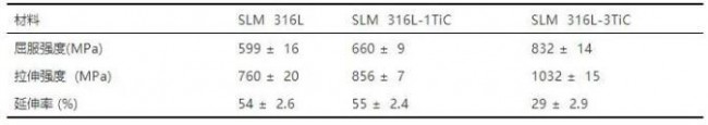 表1. SLM 3D打印 316L, 316L-1TiC 和316L-3TiC 材料的拉伸性能