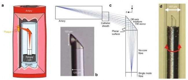 3D打印微光学器件的自由曲面通过全内反射改变光束的方向,并聚焦光束。光纤组件固定在外径为0.36毫米的薄壁扭矩线圈内,扭矩线圈允许旋转和线性运动从成像探头的近端精确地传递到远端,从而实现3D扫描。3D打印的微型成像探头在导管鞘内自由旋转,导管鞘保持静止,并在3D扫描期间保护生物体组织。[3]