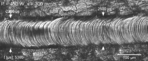 激光扫描的自上而下的高速视频静止图像(P = 450 W,v = 300 mm / s,Ø = 50 µm),具有两个延迟的开裂事件。来源:sciencedirect.com