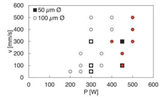 激光功率P-扫描速度v-光束直径Ø;红色标记表示导致纵向裂纹的参数组合。来源:sciencedirect.com