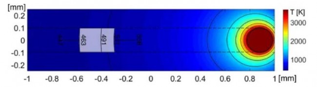 上图显示了由激光器以v = 100 mm / s,P = 450 W和Ø = 100 µm左右移动的激光所产生的热场,其中激光器位于x = 0.9毫米。模拟的熔池与实验一致,是一个接近完美的圆,并且由于钨的高导热性,即使在较高的速度下,长宽比也很小。凝固前沿的纵向热梯度超过3×10 7 K / m,而冷却速率接近5×10 6 K / s。