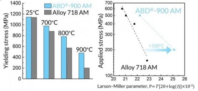 对ABD®-900AM与718合金的机械性能进行了比较。在高于800摄氏度时,ABD®-900AM的屈服应力至少提高30%,蠕变温度能力最高提高100摄氏度。