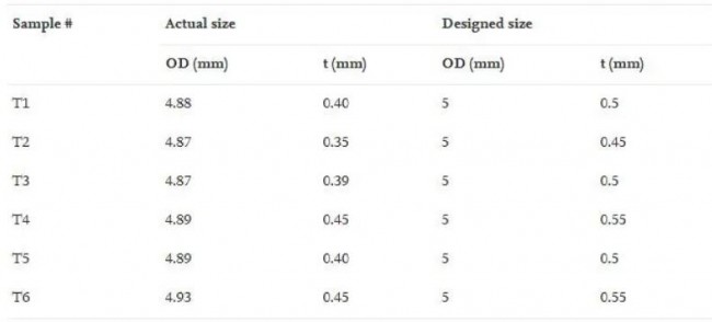 表2 通过光学显微镜测量的SLM3D打印管的实际尺寸(OD =外径,t =壁厚)。来源:Engineering Structures