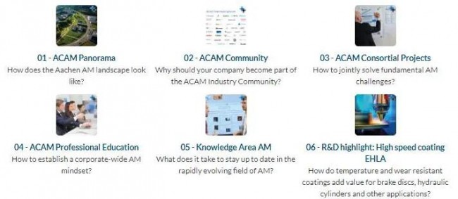 ACAM亚琛增材制造中心有限公司是基于Fraunhofer IPT生产技术研究所、Fraunhofer ILT激光技术研究所、亚琛工业大学等工业研究领域成员的合作而成立的。 ACAM致力于为制造企业提供一站式的增材制造专业技术,成立以来积累了不同先进科研领域的专业知识,并通过提供联合研发、咨询、专业技术培训和教育服务、软件和系统工程以及定制服务,帮助企业应对增材制造技术在应用中的挑战。部分ACAM的合作对象包括舍弗勒、Danfoss、GKN、GE Additive、林德集团、欧瑞康、大隈、Stratasys、大众汽车及丰田汽车等。