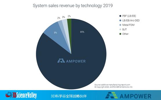 金属增材制造设备2019年按技术分类的销售收入占比©AMPOWER