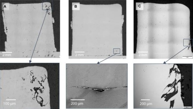 图1. A样品在不同的预热处理温度的条件下进行制造的时候的界面组织,基材温度分别为:室温 (RT)(A), 300°C (B), 和 450°C (C),在每一种条件下均存在缺陷.