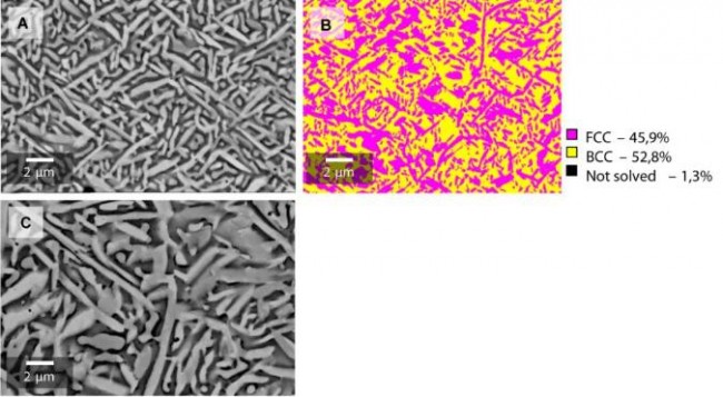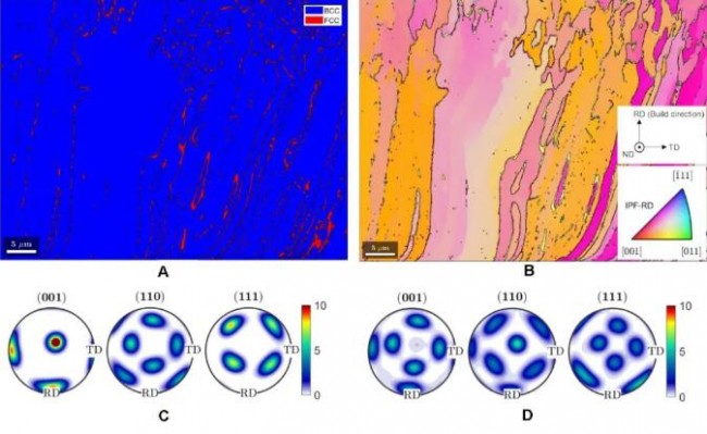 图3. LMD沉积的样品在基材预热温度为 450°C 的条件下的SEM照片: (A)样品A , (C)样品B 是900°C @ 6的条件下进行热处理的结果; (B)样品A在热处理之后进行EBSD相分析的结果.双相 的显微结构 FCC/BCC清晰可见 ,经过分析其组成为 46%/53% (FCC/BCC) .