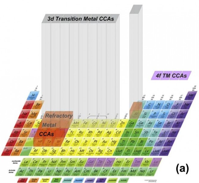 图7. 多主元合金(MPEAs)中408元素的使用频率图。常用的元素有408种多主元元素.垂直线同合金的数量成比例,同给出具体的合金数量的数值.没有数值表示该元素用于合金的种类不超过10种.Al, Co, Cr, Cu, Fe, Mn, Ni 和 Ti使用最为频繁的合金元素.该周期表来自文献.