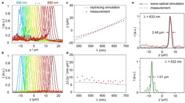 图解:a. 照射光的波长为490nm到690nm,步长为10nm的时候,光谱仪在图像的平面测量的归一化强度分布. b, 自a中进行强度轮廓的拟合的Sinc² 值. c, 每一波长的Sinc² 值的中央位置, d自c中推演出来的每微米的波长偏移. e, 线宽的模拟和分别采用红色或绿色激光进行测量的结果. 测量的半(峰高)宽度通过一对箭头来表示. d和e的测量组合产生的光谱分辨率在532nm的时候为 9.2 ± 1.1 nm , 在633nm的时候为17.8 ± 1.7 nm