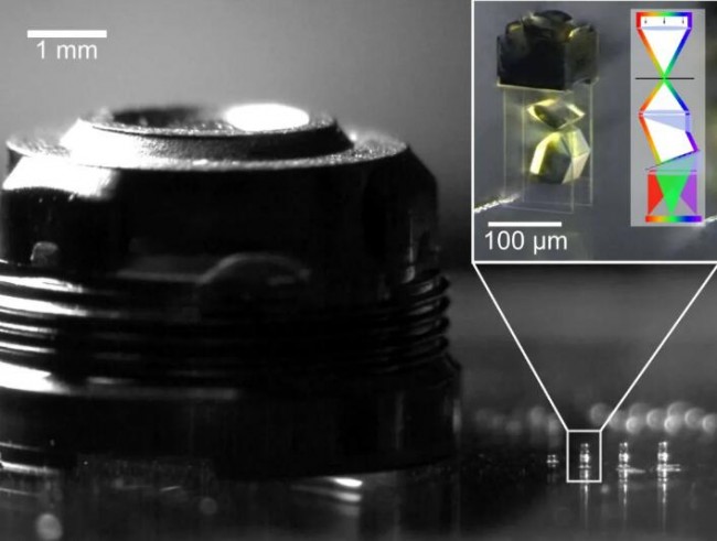 来自应用光学的Alois Herkommer教授,,斯图加特大学第四研究所的Giessen教授的领导下,为业界展示了一个对角度不敏感的3D打印的微型化的光谱仪,具有一个直接分离的空间光谱响应的特点。该3D打印的微型化的光谱仪的尺寸为100 × 100 × 300 µm3 。