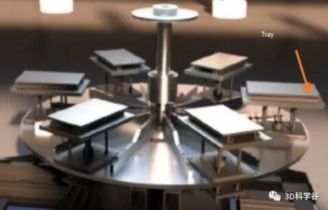 根据3D科学谷的了解,Fraunhofer开发的概念机器允许使用六个独立的工作站和六个独立的工作台,即所谓的托盘。工作站和托盘都排列成一个圆形。工作站是固定的,而托盘则布置在旋转的旋转器上,以便从一个工作站移动到下一个工作站。