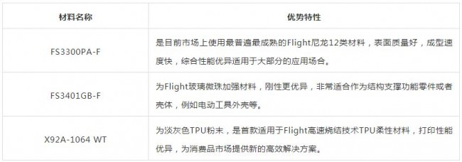 与此同时,华曙高科还发布了三款适配Flight技术的高分子粉末材料,即FS3300PA-F、FS3401GB-F,以及与雷孚斯合作研发的TPU材料 X92A-1064 WT: