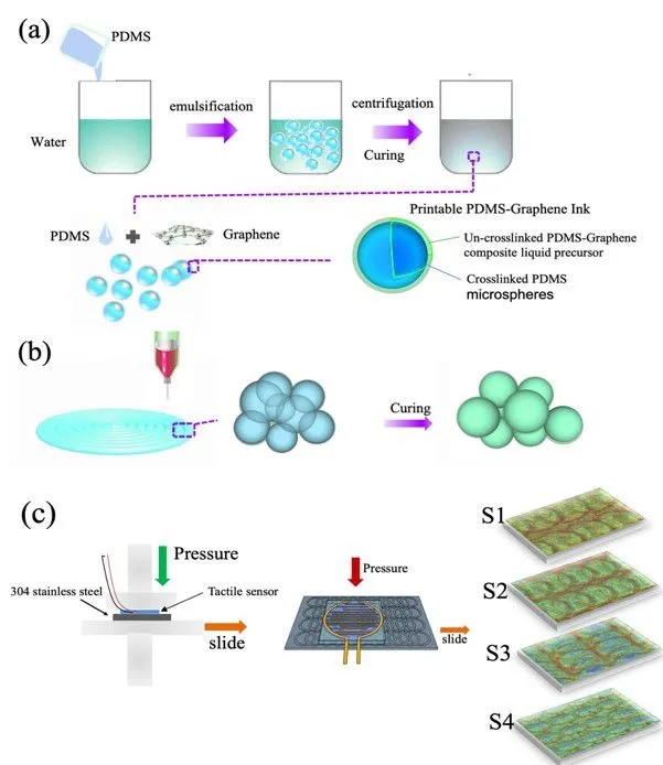 研究人员利用乳化的方法制备了PDMS微球,并且通过利用未交联的PDMS-石墨烯混合溶液对PDMS微球形成包覆;制备的石墨烯-PDMS微球油墨可以通过喷头挤出形成三维立体结构,并通过热固化成型。