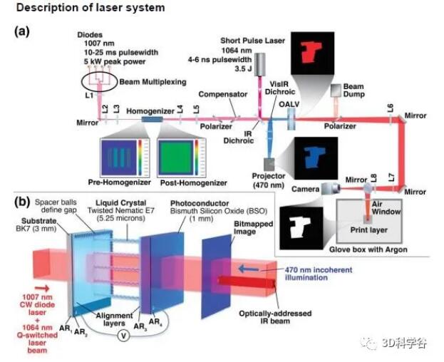 根据3D科学谷的市场观察,这种技术孵化于LLNL国家实验室。使用光寻址光阀(OALV-optically-addressable light valve)作为光掩模,一次性打印整层金属粉末。使用多路复用器,激光二极管和 Q开关激光脉冲来选择性地熔化每层金属粉末。近红外光的图案化是通过将光成像到光寻址光阀-OALV上实现的。