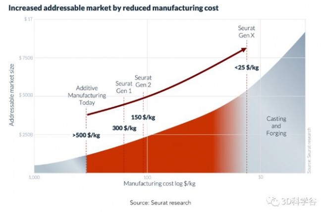 根据3D科学谷的了解,Seurat通过进一步降低制造成本来打入更大的市场。使用Seurat第一代机器,可实现约 300 美元/公斤的制造成本,这可能使市场规模增加一倍。预计Seurat 2024 年推出的第二代系统以及 2027 年和 2030 年的后续系统将真正改变游戏规则。Seurat的GenX 将制造成本降低至 25 美元/公斤以下,从而开启更大的金属制造市场。