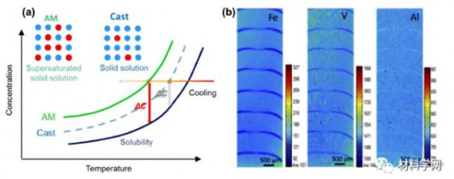 图 8。(a) 增材制造快速凝固过程形成的过饱和固溶体示意图。(b) 熔池边界处的成分波动