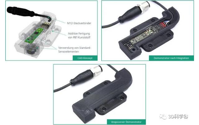 Fraunhofer IPA 的团队设计的电感式传感器由线圈、电路板和金属外壳内的插头组成,可用于在工业制造和其他应用中测量金属物体的距离。然而,由于传感器的标准、批量生产的形状,传统制造工艺的限制使得并不总是能完美地适应给定的环境。