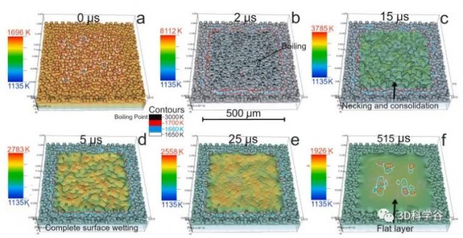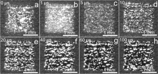 可以看到粉末迅速熔化并继续凝聚成更大的液滴,直到 40 μs,并最终形成一些较宽的液体区域,如 40 和 100 μs 之间的暗区所见。大约 100 μs 后,液体几乎静止扩张并开始凝固。