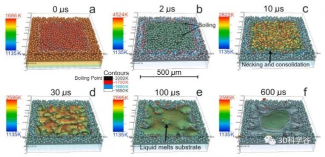 图 3a 显示了脉冲激光启动前的温度分布。在 2 μs(图 3b)时,粉末的顶部处于沸腾温度,由黑色轮廓表示。与在传统 LPBF 的实验和模拟中观察到的类似,由于液态金属在沸点引起的蒸汽喷射导致液体中的向下力。这导致熔融粉末颗粒变形和变平,增加了颗粒半径,并允许在先前未接触的相邻颗粒之间形成颈部(图 3c)。蒸气压的作用用于将粉末固结成更具凝聚力的层。此后,熔融颗粒的聚结开始并持续到大约 30 μs。然后液体开始通过传导熔化表面并扩散到它能够润湿表面的所有区域。