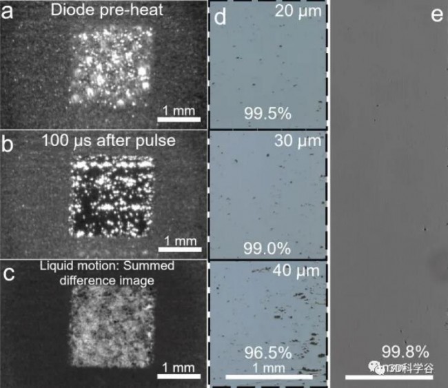 图 7. 使用 27 µm 直径粉末、30 µm 层厚的单层打印(4600 W/cm2、8 ms、~26 J/cm2、10 ns–100 μs(脉冲长度 Seurat 专有))。(a) 散布的粉末层光滑,没有大的缺陷,导致 (b) 光滑的打印层(暗区)。(c) 整个贴片的液体运动相对均匀。显示了使用三个独立层厚度 (d) 的构建,突出显示了使用较厚粉末层时产生的缺陷。使用 20 μm 厚的层,达到的密度为 99.5%。熔体工艺的进一步优化 (e) 随后能够始终如一地实现超过 99.8% 的密度。