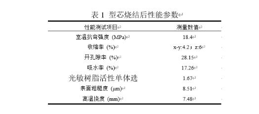 刮刀内浆料高度低且刮刀速度为10 mm/s时,可获得最小浆料涂层厚度25 μm;随着刮刀速度和刮刀高度的增加,铺料厚度铸件增加,当刮刀高度大于300 μm时,刮刀速度不再对铺料厚度产生影响。选择合适的打印参数,打印的尺寸为高120 mm、宽80 mm的多层复杂陶瓷型芯坯体,其尺寸误差<0.2 mm。陶瓷型芯烧结后性能如表1所示。最终利用烧结后的陶瓷型芯进行单晶浇注和脱芯验证,铸造出内腔完整且无残留的单晶空心叶片,型芯在强度、脱除性、表面粗糙度方面均可满足工艺要求。