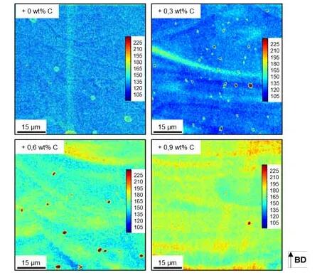 各种合金在建造状态下的碳含量的电子束微量分析(由 RWTH DAP/IEHK 提供)
