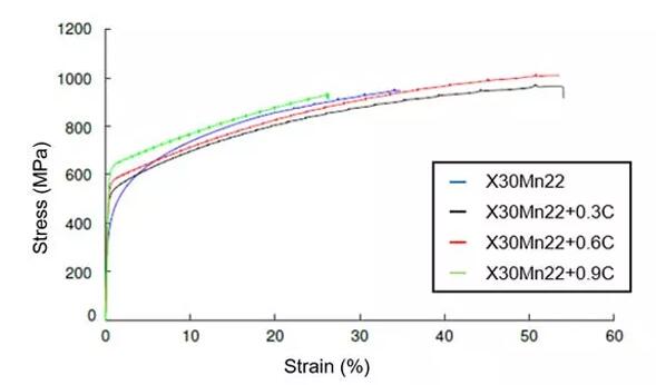 在 DAP 和 IEHK 的应用示例中,研究人员通过精确调整碳含量 (C) 来修改预合金钢粉末 (X30Mn22) 的性能。碳对 PBF-LB 工艺中材料的可加工性以及增材制造部件的拉伸强度和断裂伸长率有重大影响。为了研究不同粉末成分的性能,由不同比例的 X30Mn22 粉末和碳粉组成的粉末混合物来进行PBF-LB 工艺(高达 1.2 wt% C)加工;所有组合物的相对密度均大于 99.8%。