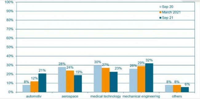 2020年九月,2021年3月,2021年9月,制造业对3D打印在各领域的应用预期变化,汽车领域呈快速上升趋势