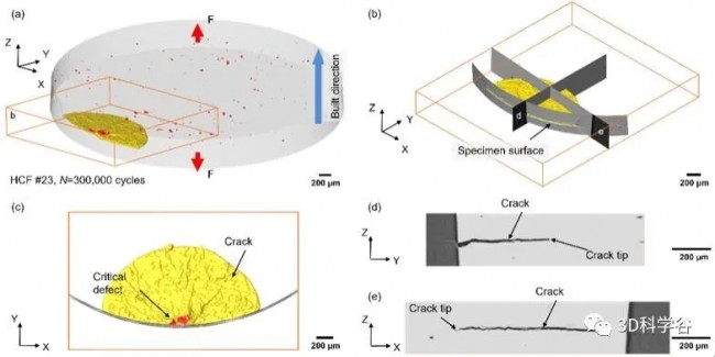 图1(a)初始缺陷(红色)和300,000次循环后检测到的裂纹(黄色)的3D渲染(b)包含裂纹的区域;(c)裂纹平面图;(d)和(e)在(b)中定义的位置(裂纹的虚拟横截面)。