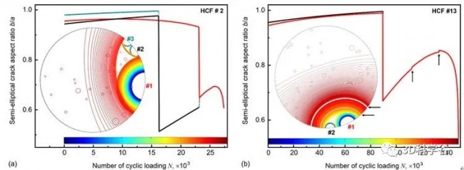 图3 基于由X射线CT先验确定的原始缺陷群,HCF样品#2(a)和样品#13(b)的多裂纹扩展模拟示意图。