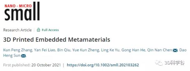 近日,厦门大学航空航天学院孙道恒教授带领的科研团队提出“微尺度3D打印+液态金属填充”方法,突破了多材料(聚合物-金属)、跨尺度(μm~cm)、共形、结构-功能一体化微结构增材制造技术,为富含这类共性特征器件的结构创新、功能创新及应用创新奠定基础。以3D复杂电磁超材料为对象验证了工艺的鲁棒性及有效性,通过优化液态金属填充流道布局及表面后处理工艺提升了超材料器件的传输性能。